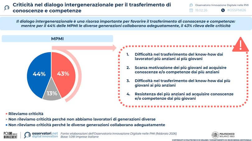 Il dialogo intergenerazionale merita attenzione particolare. Secondo i dati di Ricerca, per il 44% delle MPMI le diverse generazioni collaborano adeguatamente e senza criticità. Per il 43%, invece, il trasferimento di competenze presenta qualche problematica – soprattutto nel passaggio di know-how tecnico dai lavoratori più anziani ai più giovani (19-23% dei rispondenti).