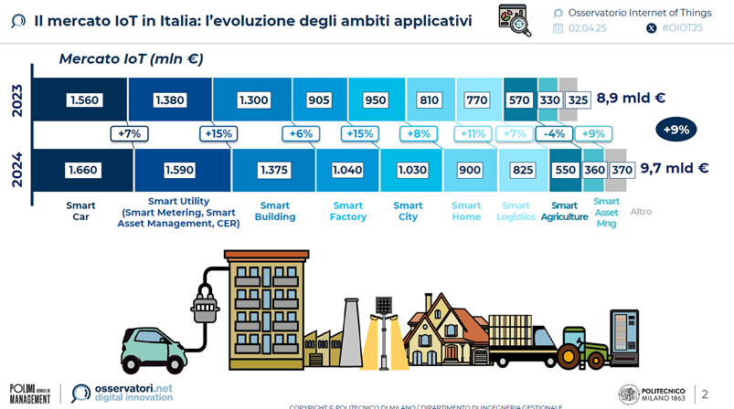 Nel 2024, secondo la Ricerca dell’Osservatorio Internet of Things della School of Management del Politecnico di Milano,gli smart object hanno mosso un indotto di 9,7 miliardi di euro, con 155 milioni di oggetti connessi, 2,6 per abitante