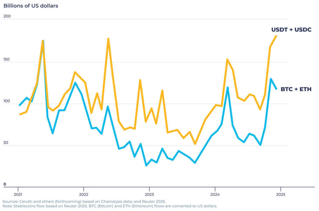 - pur essendo il valore complessivo delle stablecoins nettamente inferiore a quello delle cryptovalute storiche – USDT/Tether e USDC/ Circle capitalizzavano insieme il 10 dicembre 234 miliardi di $ (ovvero l’8,4% del valore complessivo pari a 150 miliardi di $ degli asset crypto) a fronte dei 2.244 (71,2%) di Bitcoin più Ethereum – il discorso si inverte quando si guarda ai flussi cross-border (Fig. 4 (b));