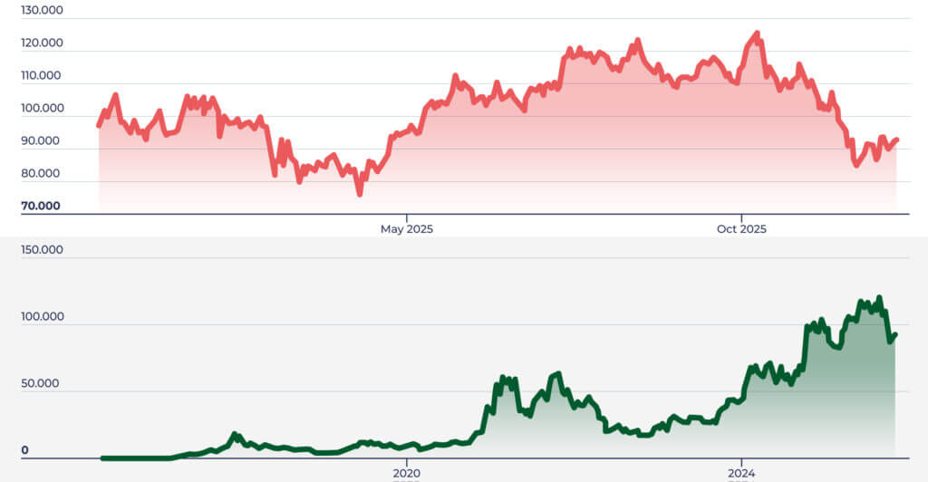 Il bitcoin nel frattempo ha confermato la sua natura fortemente speculativa (Fig. 6), in questo non differendo molto dai titoli delle Big Tech (ove però almeno qualche spunto reale spesso esiste), con un pronunciato calo dai circa 124mila $ del 7 ottobre ai poco più dei 90 del 7 dicembre (- 34mila$, ovvero- 27,5%, induemesi), dopo la precedente salita dal 75mila del 9aprile ai sopraddetti 124mila (+ 49mila, ovvero + 65% circa).