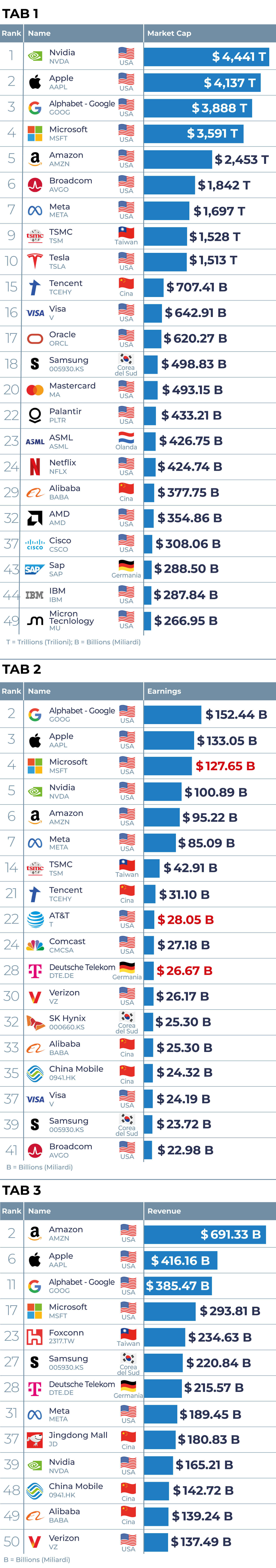 - la terza (Tab. 3) elenca le prime 13 imprese tech per revenue – ricavi – a livello globale comprese fra le top 50 in termini assoluti;